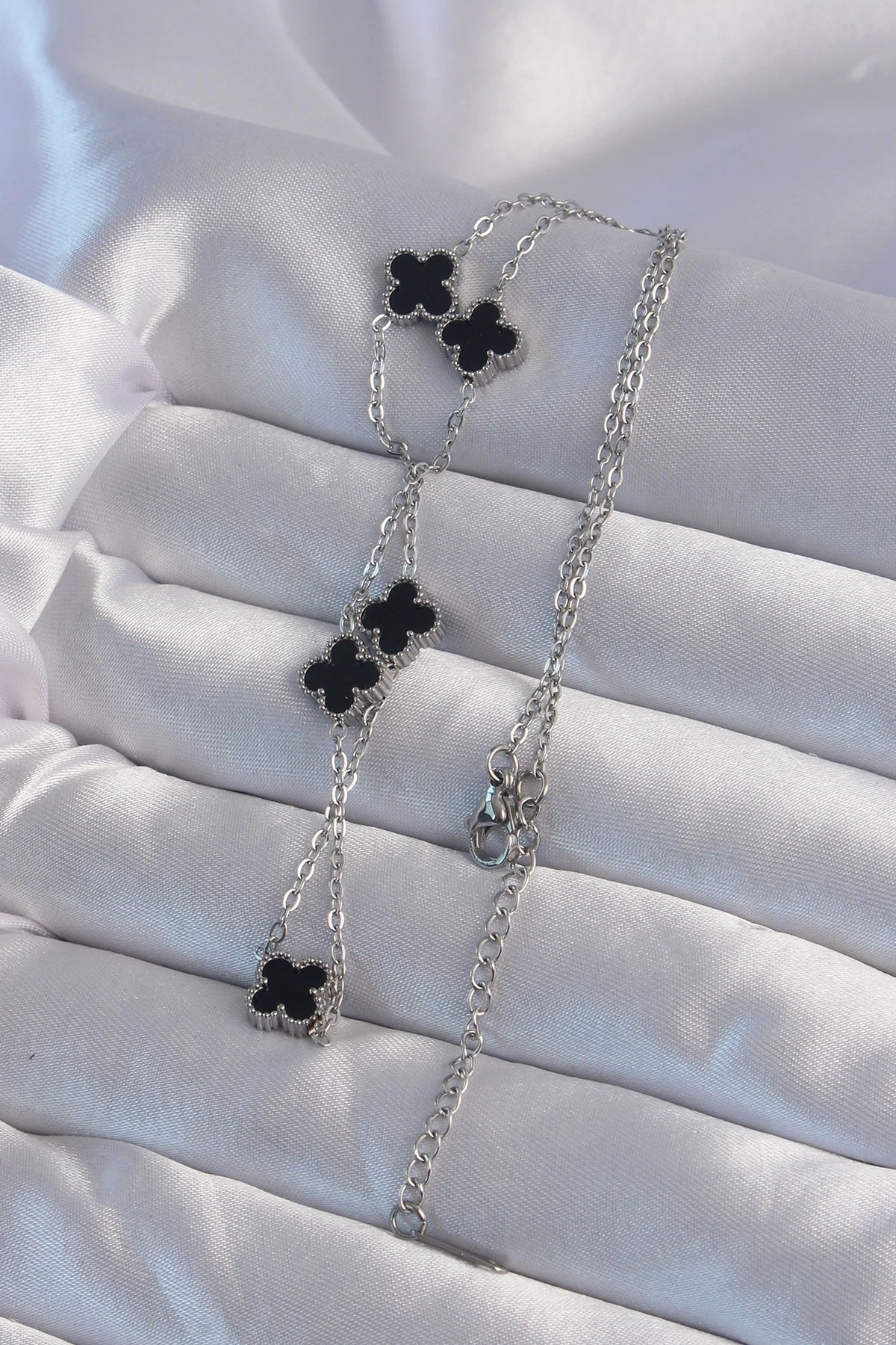 • 316L Çelik Gümüş Renk Minimal Siyah Mineli Yonca Kolye