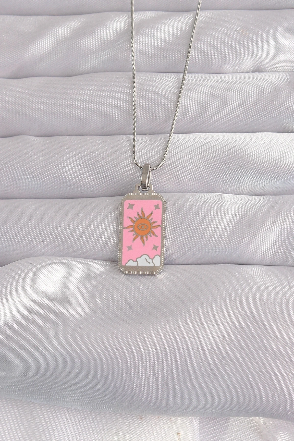 316L Çelik Gümüş Renk Pembe Mineli Güneş Model Tarot Kolye