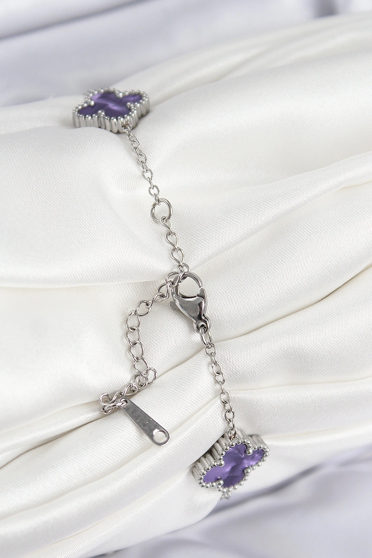 • 316L Çelik Sedefli Mor Gümüş Renk Yonca Kadın Bileklik