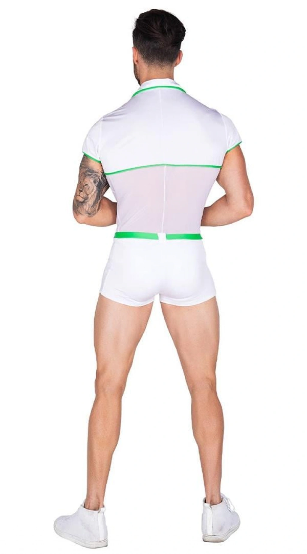 ? Beyaz zemin üzerine dinamik yeşil şerit detayları, ? Vücuda oturan, esnek ve rahat kumaş yapısı, ? Modern ve sportif çizgilerle tamamlanan şık tasarım, ? Partiler ve özel anlar için ideal fantezi seçimi.