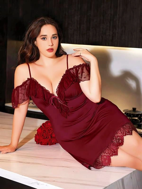 Arias Closet Büyük Beden Bordo Dantel İşlemeli İnce Askılı Gecelik, şıklığı ve rahatlığı bir arada sunan, büyük beden kadınlar için özel olarak tasarlanmış zarif bir gecelik modelidir. Bordo rengi ve dantel işlemeleri ile estetik ve romantik bir görünüm sağlar.