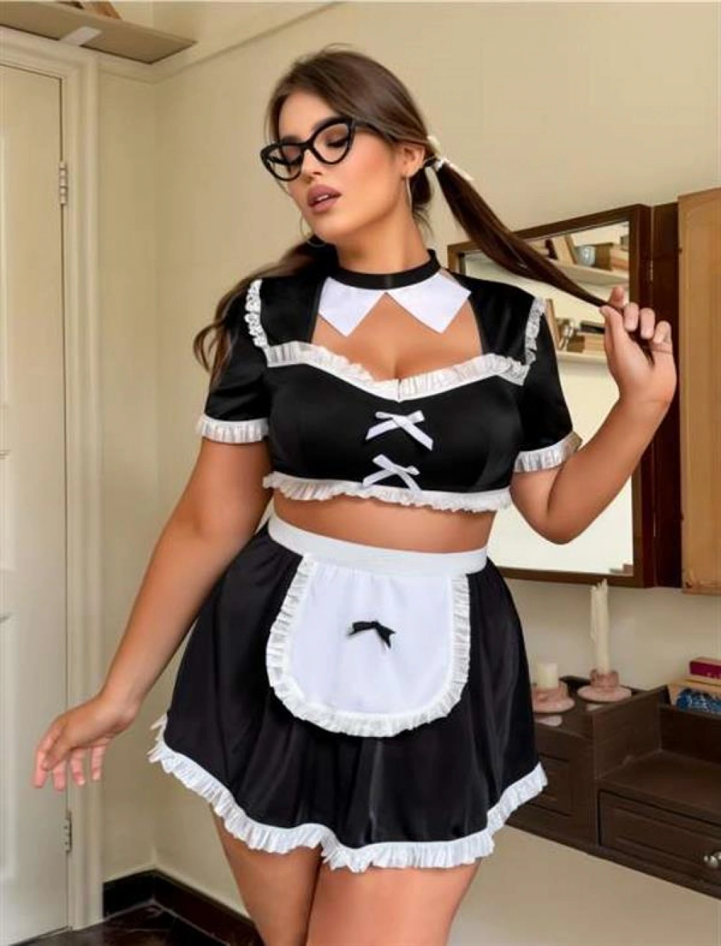 ?? Büyük Beden Mini Etekli Büstiyerli Fantezi Hizmetçi Kostümü ??
