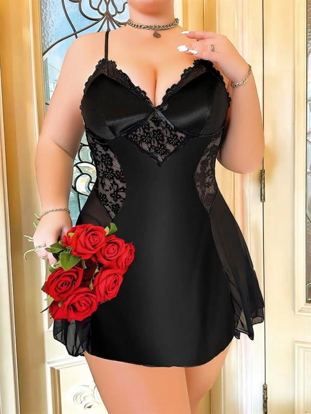 Gecenin büyüsünü teninizde hissedin... Büyük Beden Siyah Dantel İşlemeli İnce Askılı Saten Gecelik, zarif saten kumaşı ve göz alıcı dantel detaylarıyla şıklığı cesaretle buluşturuyor.