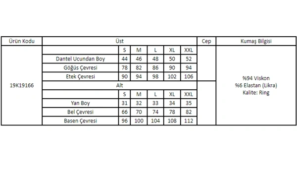 Üst: Ayarlanabilir ip askılıdır, derin V yaka dekoltelidir, pudra renklidir, göğüs ve göğüs altı brode dantellidir, örme kumaştır. Alt: Pudra renklidir, dantel detaylıdır, örme kumaştır.