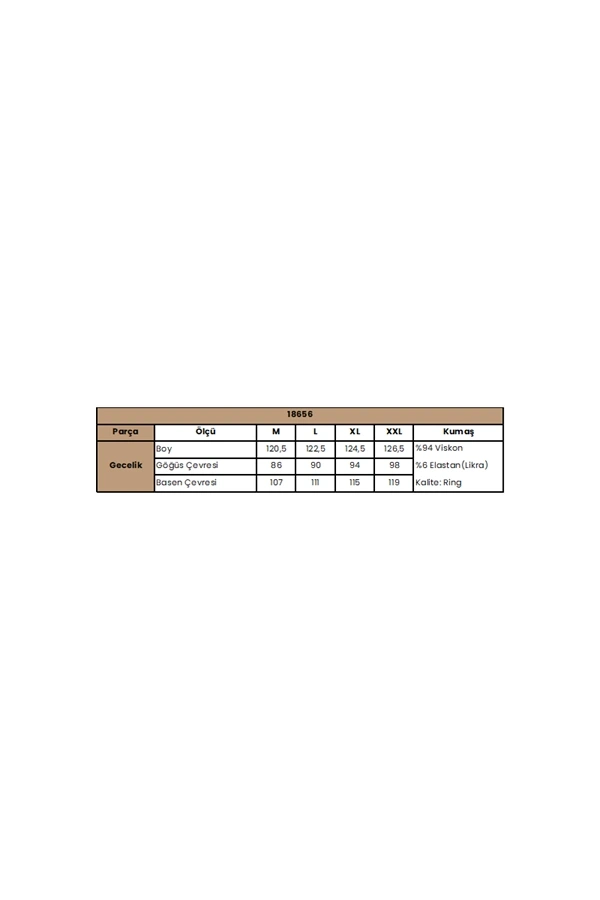 Gecelik: Beyaz renklidir, derin V Yakalıdır, sırt ve göğüs dekoltelidir, kalın askılıdır, yakası,askı kenarları ve sırtı dantellidir, yırtmaçlıdır, örme kumaştır.