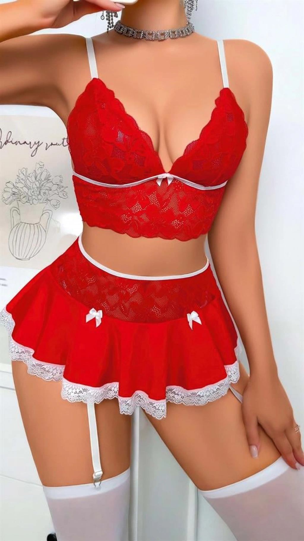 ✨ Dantel detaylı ayarlanabilir büstiyer ✨ Esnek kumaşlı mini etek ✨ Kırmızı rengin tutku dolu cazibesi ✨ Uyumlu string iç çamaşırı takıma dahildir