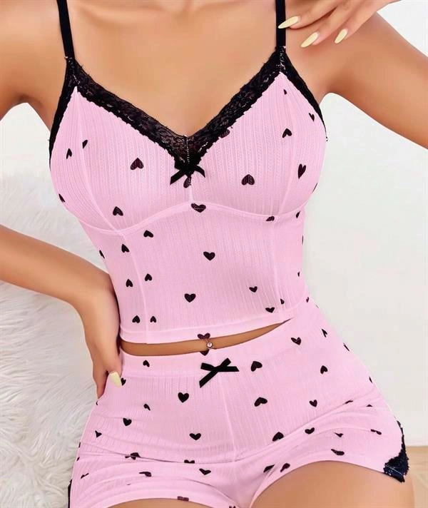 Arias Closet Pembe Kalp Desenli Askılı Şortlu Pijama Takım, evde şık, rahat ve sevimli bir görünüm arayanlar için mükemmel bir seçimdir.