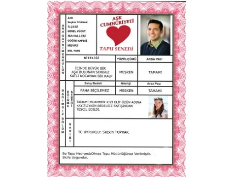 Aşk Tapusundaki sağ en üstteki resim yerine kalbinizi verdiğiniz sevgilinizin resmini ekleyerek sevgilinize tapusunu teslim edebilirsiniz.