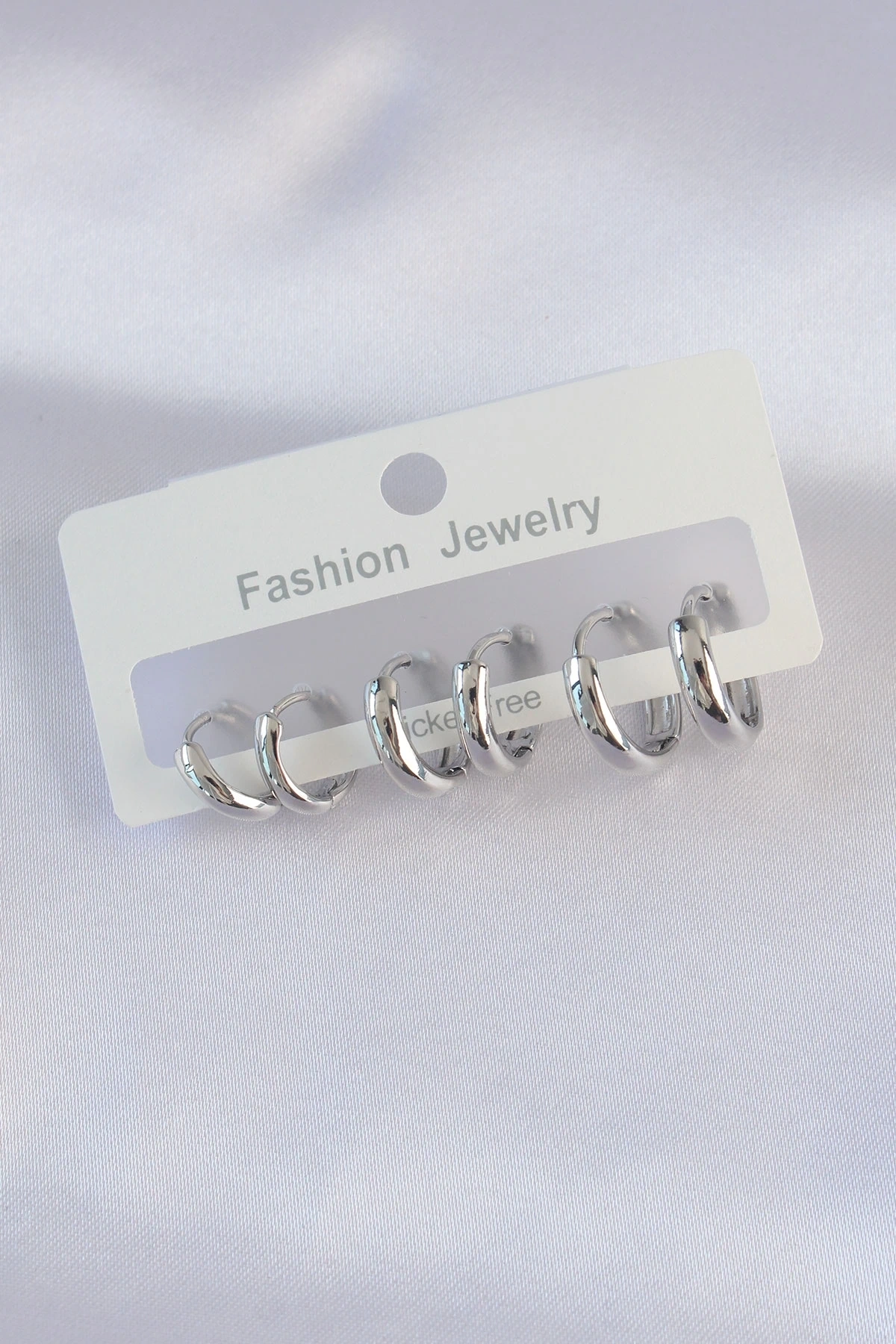 Pirinç Gümüş Renk Oval Bombeli Küpe Seti