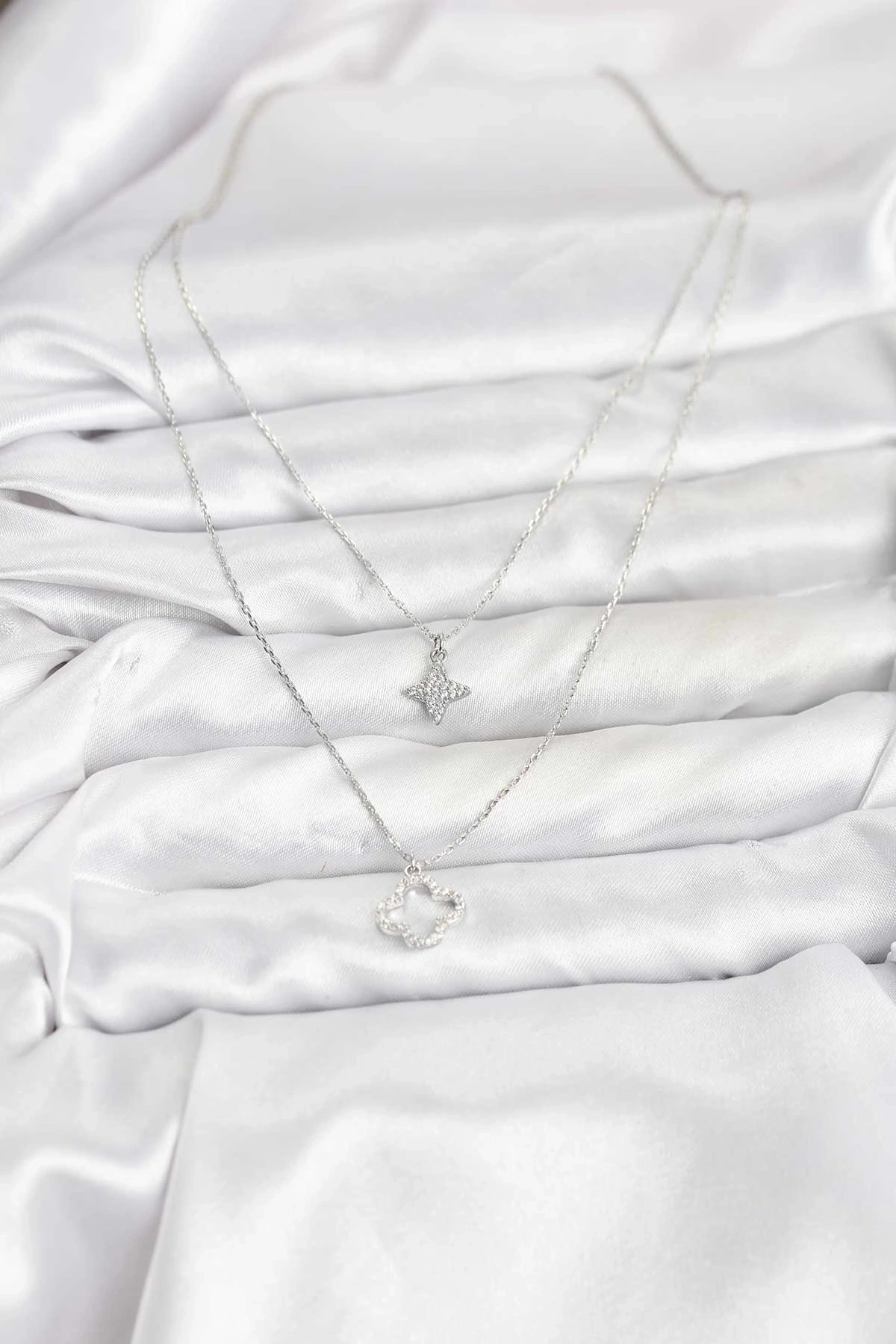 Pirinç Gümüş Renk Yonca Model 2'li Kadın Kolye
