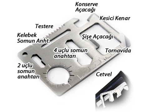 Sizi, kredi kartı boyutlarında bir usta ile tanıştırıyoruz. İster cüzdanınızda, ister cebinizde taşıyın. Tüm işlerinizde kullanın.Özel paslanmaz çelikten üretilmiştir. Özel kılıfı sayesinde cebinizde bile taşıyabilirsiniz.11 farklı fonksiyonu yerine getirebilmektedir.